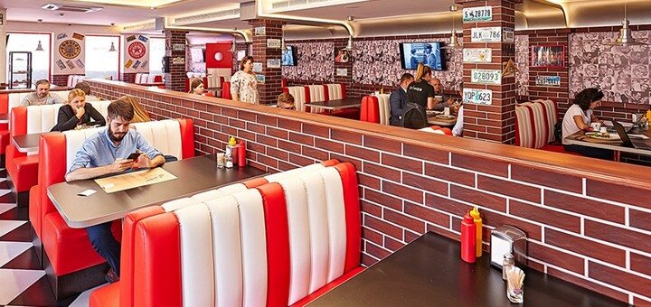 Переглядаючи улюблені серії «Друзів», ви напевно відчували бажання разом із цією веселою компанією відвідати затишний ресторанчик і скуштувати апетитний, з хрусткою скоринкою бургер. Немає потреби летіти за океан, щоб насолодитися стравами американської кухні. Вам достатньо завітати до «Diner» – ресторану традиційної американської кухні в центрі Києва, неподалік площі Перемоги, в районі універмагу «Україна».